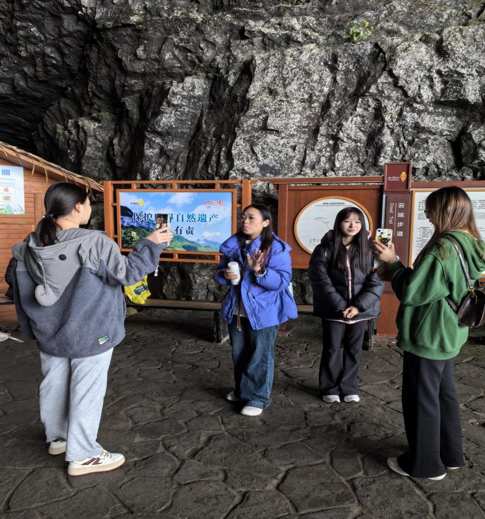 实践教学由具有多年从业经验的导游进行专业的导游服务全流程示范。从讲解内容组织、语言表达技巧、肢体语言运用,到站位姿态、引导手势等专业细节,全方位展示了职业导游应具备的职业素养,为同学们树立了学习标杆。在随后开展的分组实践环节中,各小组同学轮番扮演导游角色,围绕金佛山独特的地质演化历史、珍稀动植物资源、源远流长的佛教文化遗迹以及典型的喀斯特地貌特征等,进行了各具特色的模拟讲解。其他同学则通过认真观摩、详细记录、互相听评、全程录像等多种方式,完整记录每个讲解环节,为后续的深入分析和总结反思积累了丰富的第一手资料。
