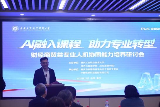 2025年12月2日,重庆工业职业技术大学成功举办财经商贸类专业人机协同能力培养研讨会。作为重工大讲堂系列活动之一,本次研讨会由重庆工业职业技术大学经济与管理学院(文化旅游学院)主办,汇聚教育界、企业界专家学者和行业精英,旨在深入落实《国务院关于深入实施 “人工智能 +” 行动的意见》,推动 “人工智能 + 教育”、“人工智能 + 产业” 深度融入财经商贸类专业建设,深入研究人机协同这一前沿课题,探讨人工智能时代下财经商贸人才培养的新路径,培育适配产业发展的优质人才,为未来人才培养方向提供深度对话平台。