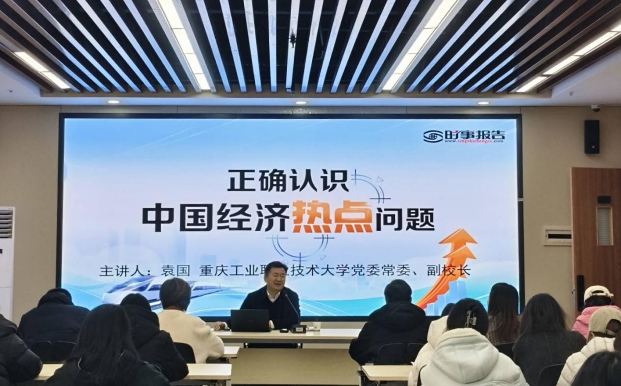 2025年12月5日,重庆工业职业技术大学党委常委、副校长袁国在第二教学楼为经济与管理学院的教师、学生党员、入党积极分子以及青马工程学员讲授形势与政策课。