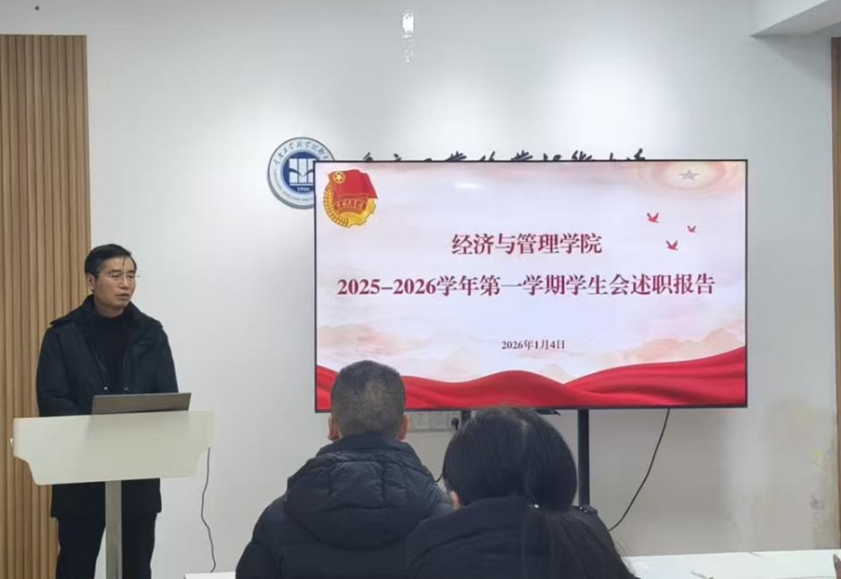 2026年1月4日,经济与管理学院在“一站式”学生综合服务中心会议室召开2025-2026学年秋季学期学生会述职评议会。学院党总支副书记、副院长麻红晓,团总支代理书记许轩瑞出席会议,校学生会主席团代表杨浩然及各班级学生代表应邀参加。