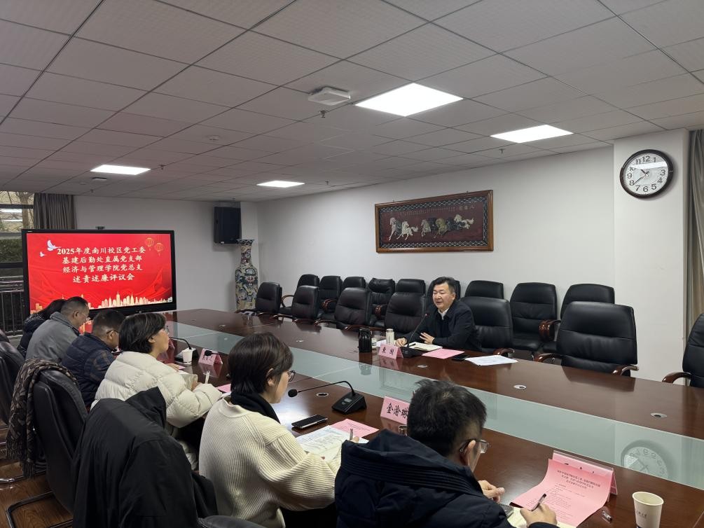 2026年1月19日,学校党委常委、副校长袁国出席在行政楼A209会议室召开的南川校区党工委、基建后勤处直属党支部、经济与管理学院党总支2025年度述责述廉评议会。南川校区党工委委员、基建后勤处直属党支部委员、经济与管理学院党总支委员及教师党员代表参加会议。