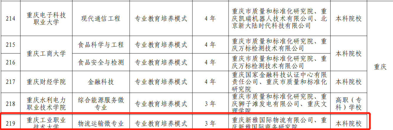 近日,国家市场监督管理总局、教育部联合公布了首批“专业与标准化教育融合试点”名单。由我校牵头,依托市级“双高”建设计划中的现代物流管理专业群,联合重庆新雅国际物流有限公司、重庆新雅国际商务研究院共同申报的 “AI+多式联运规划师”微专业项目,经过严格评审,成功获批立项。这标志着我校在深化产教融合、创新标准化人才培养模式方面取得重要突破。