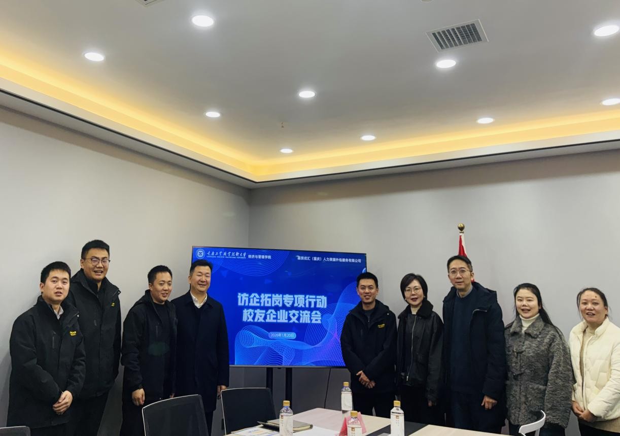 为庆祝重庆工业职业技术大学建校70周年,深化产教融合、校企合作,经济与管理学院于2026年1月20日组织开展了访企拓岗专项行动。学校党委委员、副校长袁国、经管学院院长金渝琳、学院副书记粟彦哲以及学院辅导员唐夏、宋海姣一行5人,前往校友企业——嘉贤优汇(重庆)人力资源外包服务有限公司进行实地走访,旨在搭建校企合作新平台,拓展就业岗位新渠道,推动人才培养质量提升。